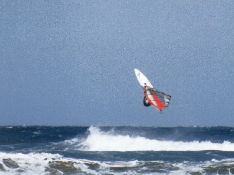 This is a very difficult trick : the name is "back loop" and consist in a high jump , enough to avoid that the mast touch the wave where you jumped , making you . . . "crash" ( usually on your back . . . a pain ! SMILE ) and complete a back rotation of 360^ upside down . . . I really LIKE it !